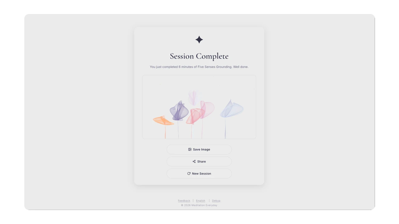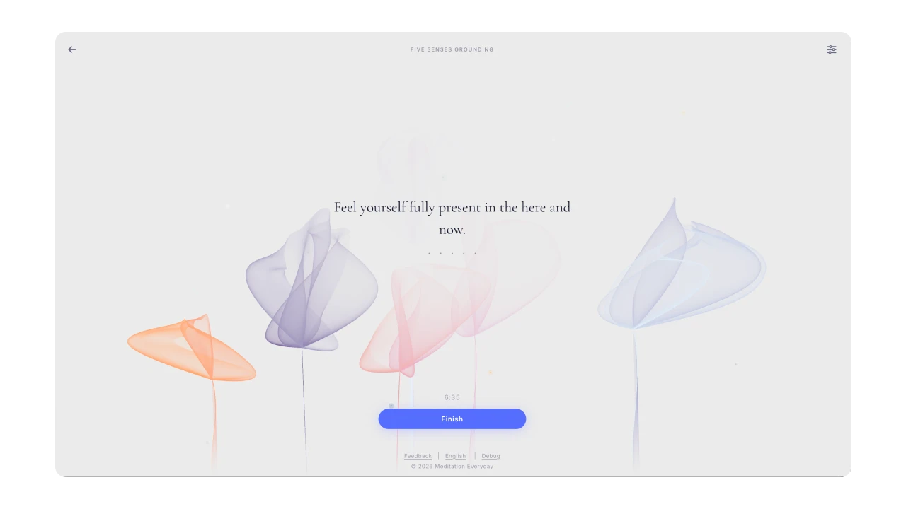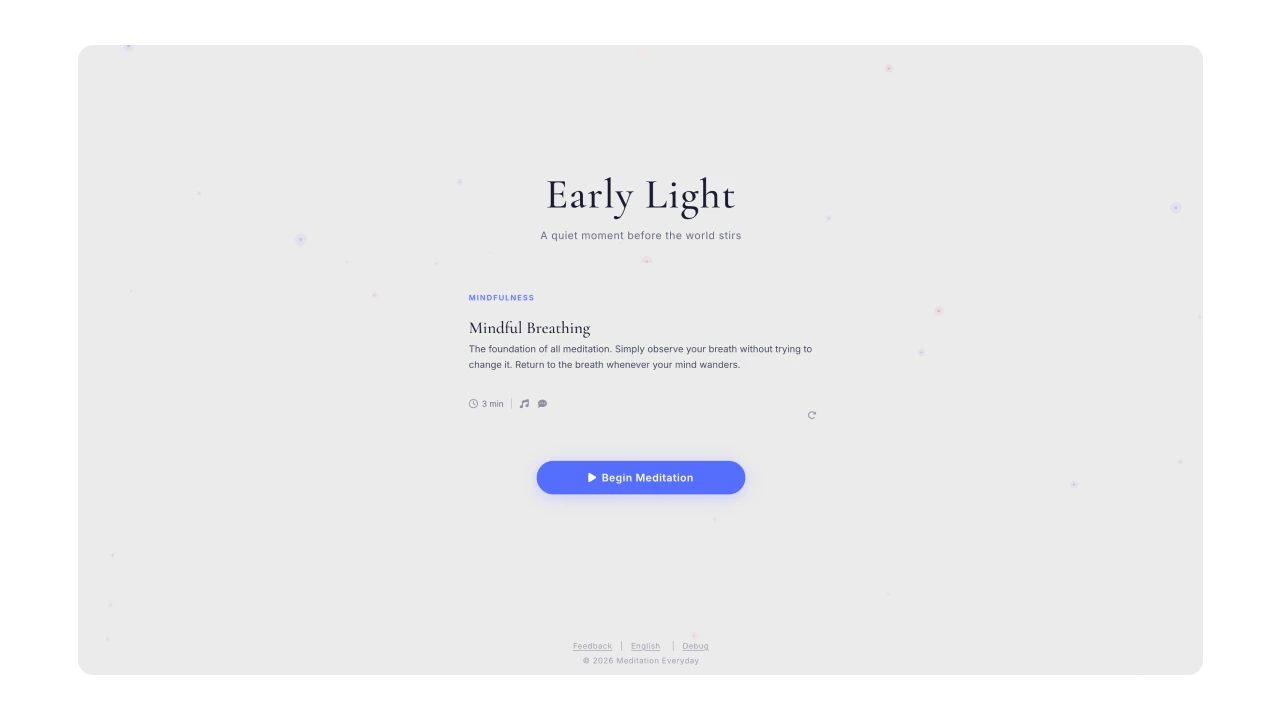Meditation Everyday is under active development, so the journey has just begun. I hope that this tool will be the place where anyone can find comfort and peace. If you feel lost and happen to see this message, please try this tool. The shortest meditation exercise takes only 3 minutes. If you happen to be someone who has more experience in meditation and would like to support this early project and the community, I will be grateful. All the feedback is appreciated.